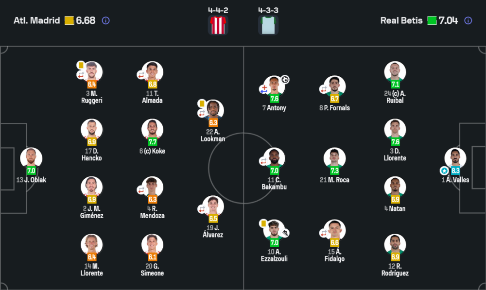 - จูเลียโน ซิเมโอเน (6.1) พลังวิ่งเยอะ ไล่บีบแนวรับเบติสแต่ไม่มีโอกาสยิงจัง ๆ
