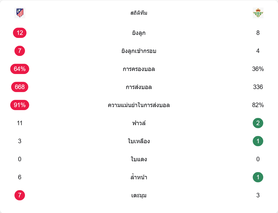 แมตช์นี้แอตเลติโก มาดริดครองบอลมากถึง 64% เทียบกับเบติสที่มีเพียง 36% เจ้าถิ่นยิงรวม 12 ครั้ง เข้ากรอบ 7 ขณะที่เบติสยิง 8 ครั้ง เข้ากรอบ 4 แต่ประตูจริงกลับอยู่ฝั่งทีมเยือนลูกเดียว แอตเลติโกต่อบอลกันถึง 668 ครั้งด้วยความแม่นยำ 91% แสดงให้เห็นว่าพวกเขาคุมจังหวะเกมได้แทบทั้งหมด ส่วนเบติสส่งบอล 336 ครั้ง ความแม่นยำ 82% เน้นเล่นน้อยแต่ได้ลุ้น