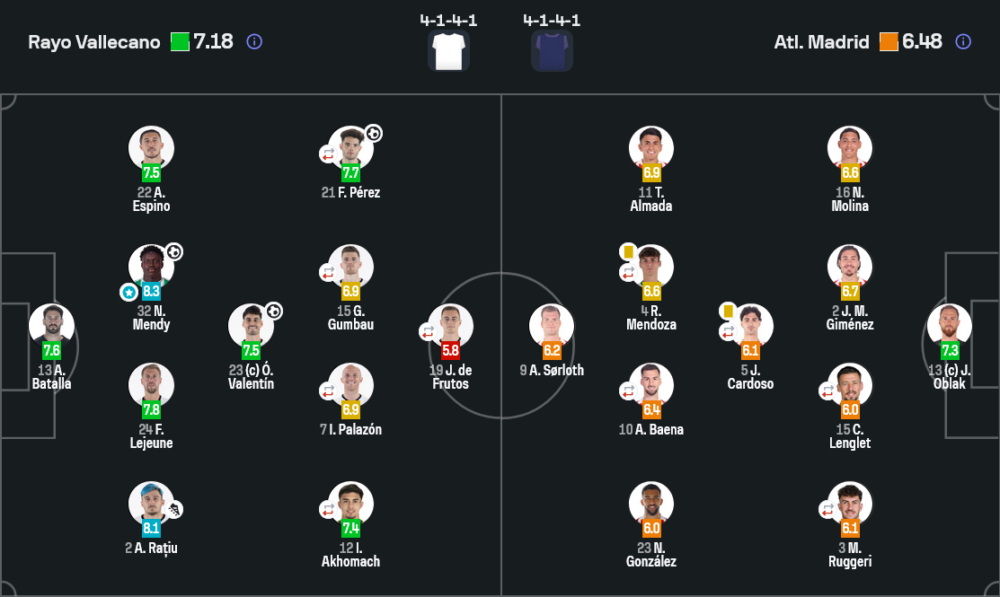 มองในมุม วิเคราะห์บอล รูปแบบการเล่น 4-1-4-1 ของทั้งสองทีมเหมือนกัน แต่รายละเอียดในเชิงแท็กติกต่างกันชัดเจน ราโยของอิญิโญ เปเรซ เลือกวางบาเลนตินยืนต่ำหน้าคู่เซ็นเตอร์คอยซ้อน ส่วนสามมิดฟิลด์ตัวบนเน้นวิ่งบีบสูง ปิดไลน์จ่ายของการ์โดโซตั้งแต่แดนแรก เมื่อคู่แข่งเสียจังหวะ เจ้าบ้านจะเคลื่อนบอลออกด้านข้างอย่างรวดเร็วให้รัชชูและเอสปิโนเติมขึ้นพร้อมกัน กลายเป็นความได้เปรียบเชิงพื้นที่ที่ทำให้แอตเลติโกต้องถอยลึก