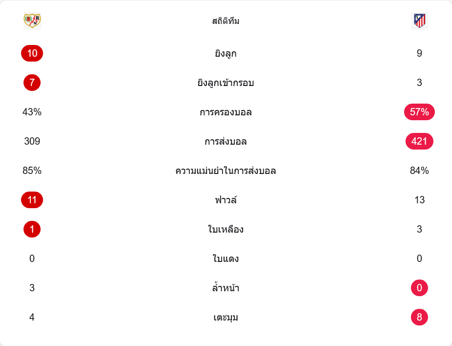 แม้ตัวเลขการครองบอลจะบอกว่าแอตเลติโกเหนือกว่า ถือบอลประมาณ 57% ต่อ 43% และผ่านบอลมากกว่าราโย 421 ต่อ 309 ครั้ง พร้อมอัตราสำเร็จใกล้เคียงกันราว 84–85% แต่ความคมในพื้นที่สุดท้ายกลับเป็นเจ้าถิ่นที่ทำได้ดีกว่าอย่างชัดเจน ราโยยิงทั้งหมด 10 ครั้ง เข้ากรอบถึง 7 ลูก และเปลี่ยนเป็นสามประตูเต็มเม็ดเต็มหน่วย ขณะที่ตราหมียิง 9 ครั้ง เข้ากรอบเพียง 3 ลูก ซึ่งบาตายาปัดทิ้งได้ทั้งหมด
