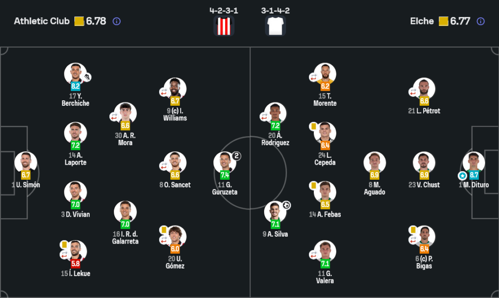 บ้านกีฬา ขอยกให้ มาติอัส ดิทูโร นายด่านเอลเช่คือคนที่ทำให้เกมนี้ไม่กลายเป็นสกอร์ขาดตั้งแต่ครึ่งแรก คะแนน 8.7 คือคำตอบว่าเขาเซฟกี่ครั้งก็ยังไม่พอจะช่วยทีมรอด เพราะแนวรุกและแนวรับตรงหน้าเขาพลาดในจังหวะชี้ชะตาสองหน จนต้องยอมจำนนต่อจุดโทษท้ายเกม