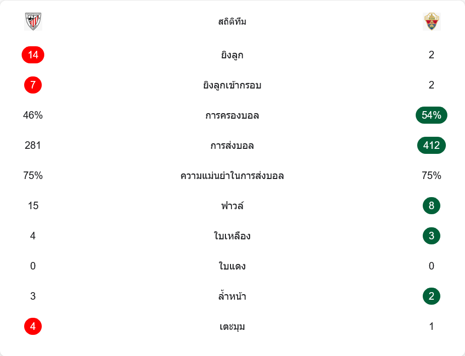 เกมนี้ตัวเลขมันฟ้องชัด บิลเบายิงถึง 14 ครั้ง เข้ากรอบ 7 ครั้ง ขณะที่เอลเช่ยิงเพียง 2 ครั้งและเข้ากรอบเท่ากัน 2 ครั้ง แม้เอลเช่จะครองบอล 54 เปอร์เซ็นต์และจ่ายบอลมากถึง 412 ครั้ง แต่เป็นการครองที่พาไปไม่ถึงจุดจบ ส่วนบิลเบาครองบอล 46 เปอร์เซ็นต์ จ่ายบอล 281 ครั้ง แต่เน้นจ่ายเพื่อทำร้ายจริง ความแม่นยำการส่งบอลทั้งสองทีมเท่ากันที่ 75 เปอร์เซ็นต์