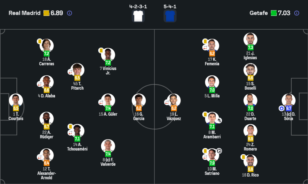 เดวิด โซเรีย รับรางวัลผู้เล่นยอดเยี่ยมด้วยคะแนน 9.7 และมันไม่ใช่แค่ “เซฟเยอะ” แต่เป็นการเซฟที่เปลี่ยนผลการแข่งขันจริงๆ เขาปัดลูกยิงของกือแลร์ จัดการจังหวะซ้ำซ้อนในครึ่งแรก และยังปิดมุมโหม่งจ่อๆ ของโรดรีโก้ในครึ่งหลังแบบเยือกเย็น ที่สำคัญคือการคุมพื้นที่หน้าปากประตู ทำให้ลูกครอสและลูกตั้งเตะของมาดริดไม่เคยกลายเป็นความโกลาหล นี่คือผลงานที่พาทีมเยือนเก็บสามแต้มล้ำค่าได้ด้วยสองมือของเขา
