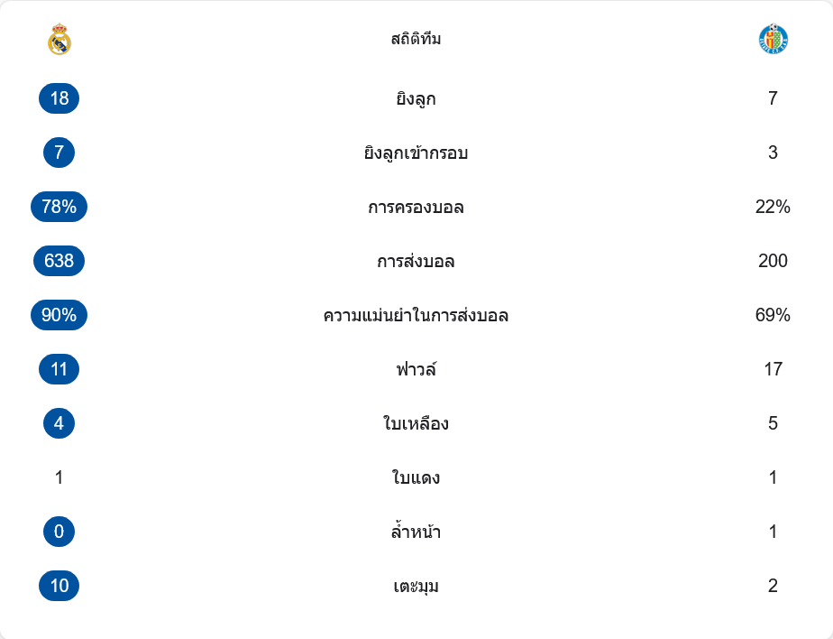 มาดริดยิงรวม 18 ครั้ง เข้ากรอบ 7 ครั้ง ครองบอลถึง 78% ต่อบอล 638 ครั้งด้วยความแม่นยำ 90% แต่ทั้งหมดถูกทำให้ไร้ค่าเพราะเจอโซเรียที่เหนียว และแนวรับเกตาเฟ่ที่ยืนบล็อกเป็นระบบ ขณะที่เกตาเฟ่ยิงแค่ 7 ครั้ง เข้ากรอบ 3 ครั้ง แต่มีประตูจากความเฉียบคม เกมฟาวล์ฝั่งทีมเยือนมากกว่า 17 ครั้ง ใบเหลือง 5 ใบ ส่วนมาดริดฟาวล์ 11 ครั้ง ใบเหลือง 4 ใบ และมีใบแดงฝั่งละ 1 ใบ นอกจากนี้มาดริดได้เตะมุมถึง 10 ครั้ง แต่เปลี่ยนเป็นประตูไม่ได้เลย ในวันที่รายละเอียดเล็กๆ พาเกมไหลไปทางทีมที่ “เอาอยู่” มากกว่า