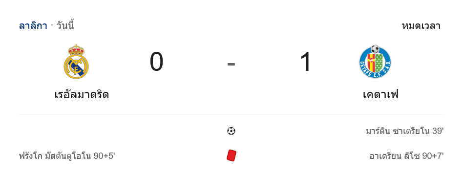 บ้านผลบอล สรุปหลังเกม ลาลีกา ราชันช็อก ซาเตรียโนยิงคม เกตาเฟ่บุกเชือด เรอัล มาดริด 0-1 สั่นสะเทือนลุ้นแชมป์