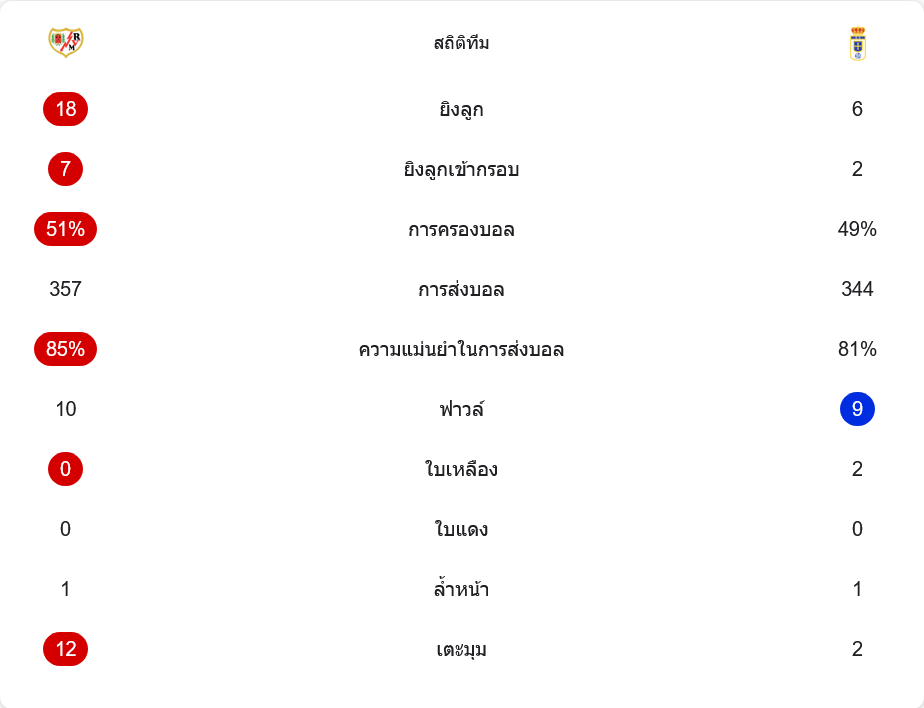 เกมนี้ราโยเหนือกว่าทั้งรูปเกมและตัวเลข พวกเขายิงทั้งหมด 18 ครั้ง เข้ากรอบ 7 ครั้ง ขณะที่โอเบียโดยิงได้แค่ 6 ครั้ง เข้ากรอบ 2 ครั้ง การครองบอลใกล้เคียงกันที่ 51% ต่อ 49% แต่คุณภาพจังหวะสุดท้ายต่างกันชัด การจ่ายบอลราโย 357 ครั้ง ความแม่น 85% ส่วนโอเบียโด 344 ครั้ง ความแม่น 81% ด้านวินัยเกม ราโยแทบไม่เสียเหลืองเลย ในขณะที่โอเบียโดโดนใบเหลือง 2 ใบ และจุดที่สะท้อนแรงกดดันได้ที่สุดคือเตะมุม ราโยได้ถึง 12 ครั้ง ส่วนโอเบียโดได้เพียง 2 ครั้ง