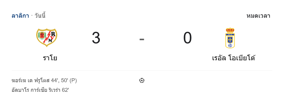 ช่วงเวลาที่เหลือ โอเบียโดพยายามฮึด มีจังหวะได้เตะมุมและยิงไกลบ้าง แต่ ออกุสโต้ บาตายา เซฟสำคัญช่วยเก็บคลีนชีตให้ทีม จบเกม ผลบอล ออกมาชัดเจน ราโย บาเยกาโน่ 3-0 เรอัล โอเบียโด