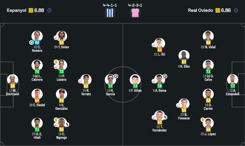 การ์ลอส โรเมโร่ คือคนที่เด่นที่สุดของเอสปันญ่อลในเกมนี้ ด้วยคะแนน 8.0 เขาเติมเกมรุกได้ต่อเนื่อง ช่วยสร้างแรงกดดันทางฝั่งซ้าย และยังทำหน้าที่เกมรับได้ดีตลอด 90 นาที เป็นหนึ่งในตัวหลักที่ทำให้เจ้าถิ่นคุมเกมได้เหนือกว่า แม้สุดท้ายจะได้แค่แต้มเดียวก็ตาม