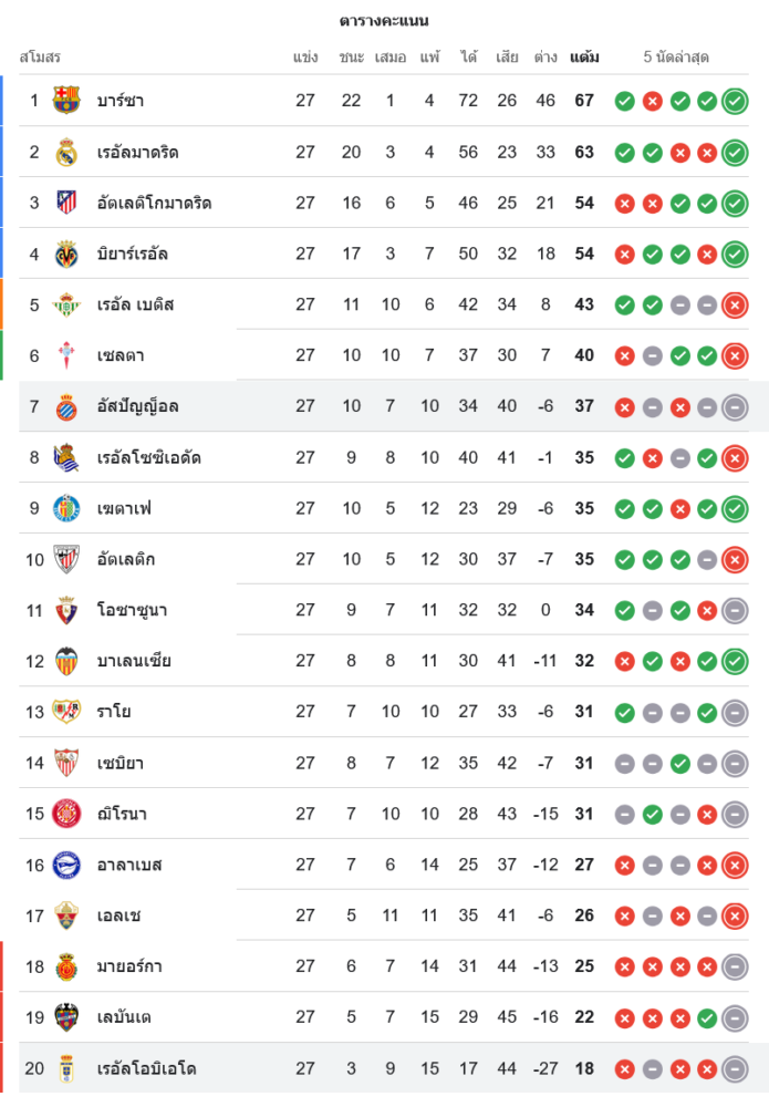 สถานการณ์ในตารางคะแนนลาลีกา สเปน
