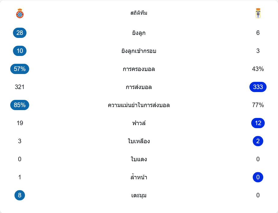 เกมนี้เอสปันญ่อลเหนือกว่าค่อนข้างชัด พวกเขายิง 28 ครั้ง เข้ากรอบ 10 ครั้ง ครองบอล 57 เปอร์เซ็นต์ และได้เตะมุมถึง 8 ครั้ง ส่วนโอเบียโด้ยิง 6 ครั้ง เข้ากรอบ 3 ครั้ง ครองบอล 43 เปอร์เซ็นต์ และไม่มีเตะมุมเลย ด้านวินัยในเกม เอสปันญ่อลฟาวล์ 19 ครั้ง โอเบียโด้ฟาวล์ 12 ครั้ง โดยเจ้าถิ่นโดน 3 ใบเหลือง ส่วนทีมเยือนได้ 2 ใบเหลือง