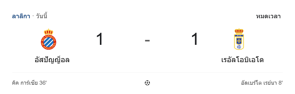 ศึก ลาลีกา สเปน คู่นี้จบลงแบบเจ็บ ๆ คัน ๆ สำหรับเจ้าถิ่น เมื่อเอสปันญ่อลเปิดบ้านเสมอเรอัล โอเบียโด้ 1-1 ทั้งที่เป็นฝ่ายเดินเกมรุกกดดันได้มากกว่าเกือบทั้งนัด โดยเฉพาะในครึ่งหลังที่ลุยใส่ไม่ยั้งแต่ยังเจาะไม่เข้า ส่งให้ ผลบอลสด นัดนี้แบ่งกันไปทีมละแต้มแบบที่ฝั่งเจ้าบ้านน่าเสียดายหนักกว่า