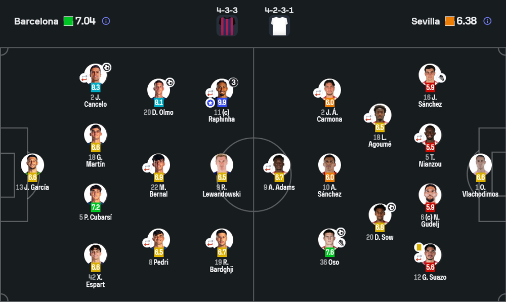 ราฟินญ่าคือพระเอกของเกมแบบไม่มีข้อกังขา หลังทำคะแนนสูงสุด 9.9 และกดแฮตทริกพาทีมไล่ถล่มเซบีย่า เขาทั้งนิ่งในจังหวะจุดโทษ เคลื่อนที่ฉลาด และจบสกอร์เด็ดขาด เป็นตัวที่ทำให้เกมรับทีมเยือนปั่นป่วนตลอดทั้งคืน
