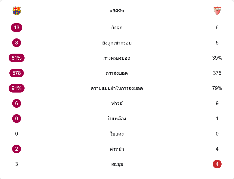 ถ้ามองในเชิง วิเคราะห์บอล เกมนี้ บาร์เซโลน่าเหนือกว่าชัดทั้งการครองบอล การเพรสซิ่ง และความเด็ดขาดในพื้นที่สุดท้าย ระบบ 4-3-3 ของพวกเขายืดหยุ่นมาก โดยเฉพาะการขยับของ ราฟินญ่า, โอลโม่ และ คันเซโล่ ที่เล่นงานแนวรับเซบีย่าได้ตลอด