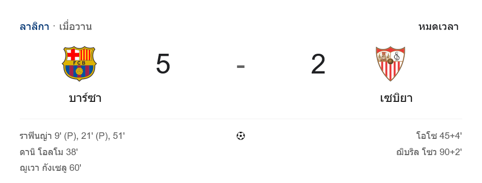 ช่วงทดเวลาบาดเจ็บ เซบีย่ามาได้ประตูปิดท้ายจาก ฌิบริล โซว์ โหม่งเข้าไปในนาที 90+2 ทว่าเป็นเพียงประตูปลอบใจ เพราะสุดท้าย บาร์เซโลน่า ปิดเกมชนะ 5-2 แบบเด็ดขาด และทำให้แฟนบอลที่ตามลุ้น บ้านผลบอล ได้เห็นเกมรุกระดับโหดของจ่าฝูงอย่างเต็มตา