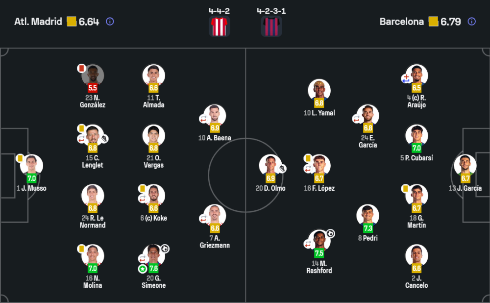 จูเลียโน ซิเมโอเน คว้ารางวัล Player of the Match ด้วยคะแนน 7.6 แม้แอตเลติโก้ มาดริด จะแพ้ แต่ผลงานส่วนตัวของเขาโดดเด่นมาก ทั้งการวิ่งกดดัน ความขยัน และการจบสกอร์ประตูขึ้นนำอย่างเฉียบคม เขาคือคนที่สร้างปัญหาให้แนวรับบาร์เซโลนามากที่สุดตลอดช่วงที่อยู่ในสนาม
