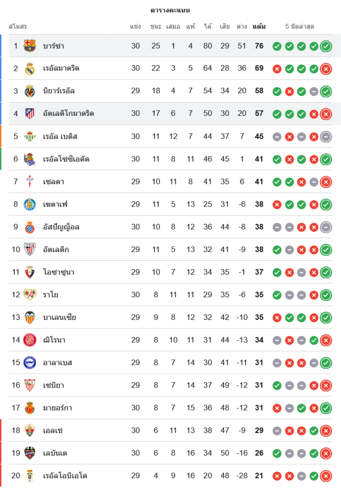 สถานการณ์ในตารางคะแนนลาลีกา สเปน