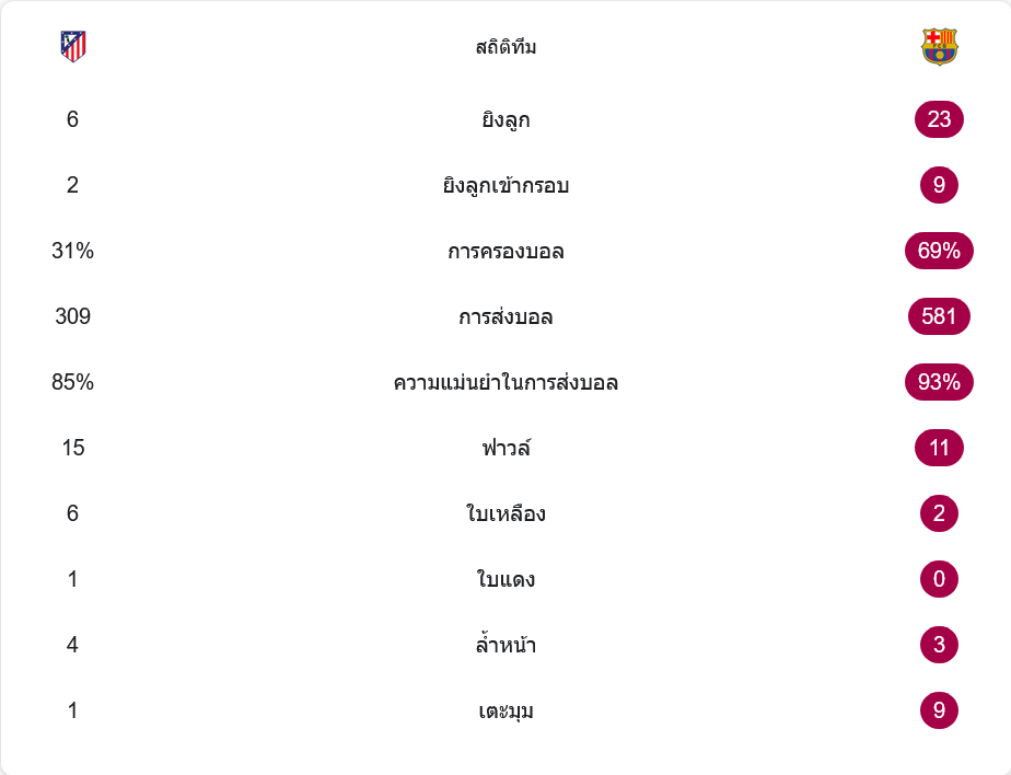 แอตเลติโก้ทำฟาวล์ 15 ครั้ง ได้ใบเหลือง 6 ใบ และมี 1 ใบแดง ขณะที่บาร์เซโลนาโดนใบเหลือง 2 ใบ ไม่มีใบแดง อีกจุดที่เห็นชัดคือบาร์ซ่าได้เตะมุมถึง 9 ครั้ง ส่วนเจ้าถิ่นมีเพียง 1 ครั้ง แสดงถึงแรงกดดันที่ทีมเยือนสร้างได้ตลอดทั้งเกม โดยเฉพาะหลังคู่แข่งเหลือผู้เล่นน้อยกว่า