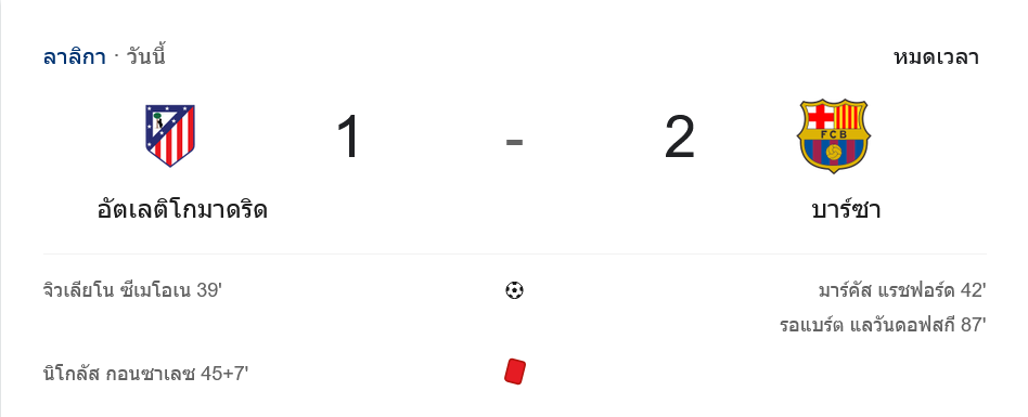 - ⚽ นาที 42 มาร์คัส แรชฟอร์ด ยิงตีเสมอให้ บาร์เซโลนา 1-1