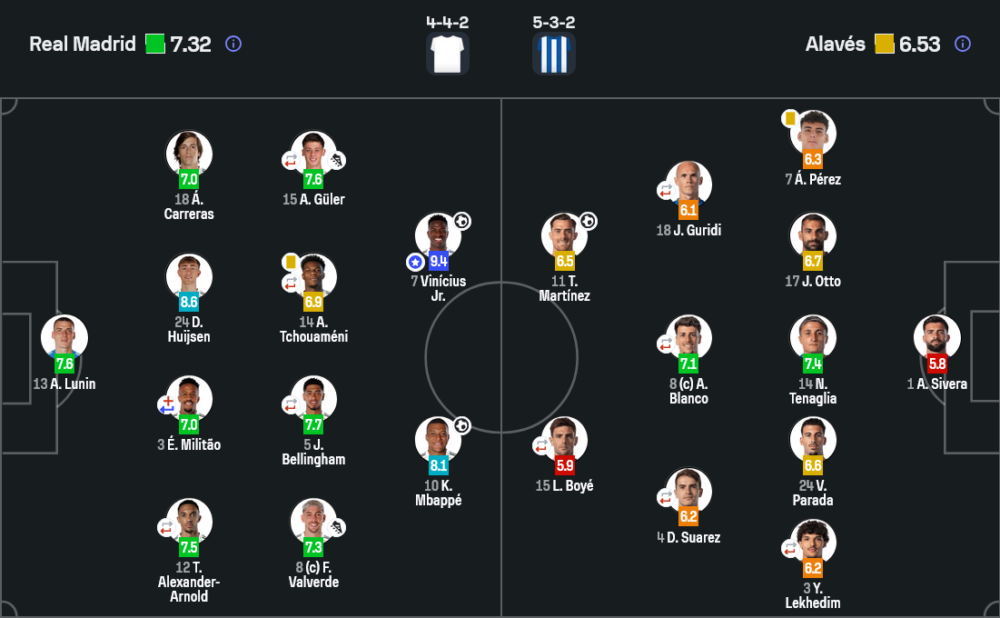 วินิซิอุส จูเนียร์ คือนักเตะที่โดดเด่นที่สุดของเกมนี้ด้วยคะแนน 9.4 เขายิงประตูสำคัญให้มาดริดหนี 2-0 และสร้างปัญหาให้แนวรับอลาเบสตลอดทั้งเกม ทั้งความเร็ว การลากบอล และจังหวะเล่นหนึ่งต่อหนึ่ง ทำให้เขาเป็นตัวอันตรายที่สุดของเจ้าบ้านอย่างแท้จริง