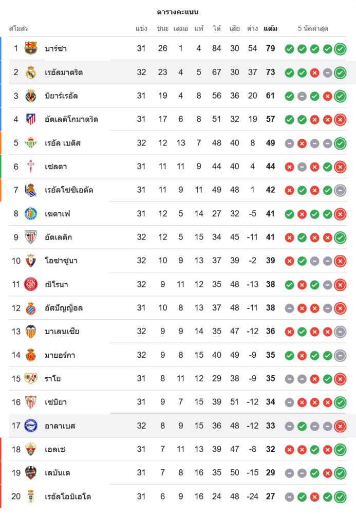 สถานการณ์ในตารางคะแนนลาลีกา สเปน