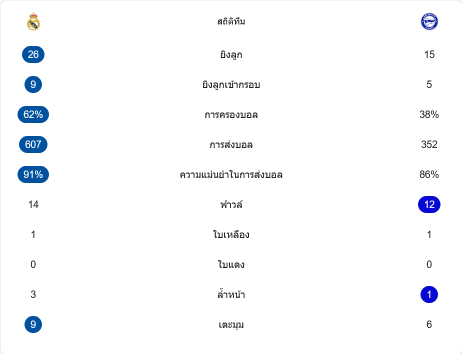 เกมนี้เรอัล มาดริดเหนือกว่าแทบทุกด้าน พวกเขายิง 26 ครั้ง เข้ากรอบ 9 ครั้ง ขณะที่อลาเบสยิง 15 ครั้ง ตรงกรอบ 5 ครั้ง การครองบอลของเจ้าถิ่นอยู่ที่ 62 เปอร์เซ็นต์ เทียบกับ 38 เปอร์เซ็นต์ของทีมเยือน มาดริดผ่านบอล 607 ครั้งด้วยความแม่นยำ 91 เปอร์เซ็นต์ ส่วนอลาเบสผ่าน 352 ครั้งแม่นยำ 86 เปอร์เซ็นต์ เจ้าถิ่นได้เตะมุม 9 ครั้ง มากกว่าอลาเบสที่ได้ 6 ครั้ง และทั้งสองทีมโดนใบเหลืองฝั่งละ 1 ใบ ไม่มีใบแดง