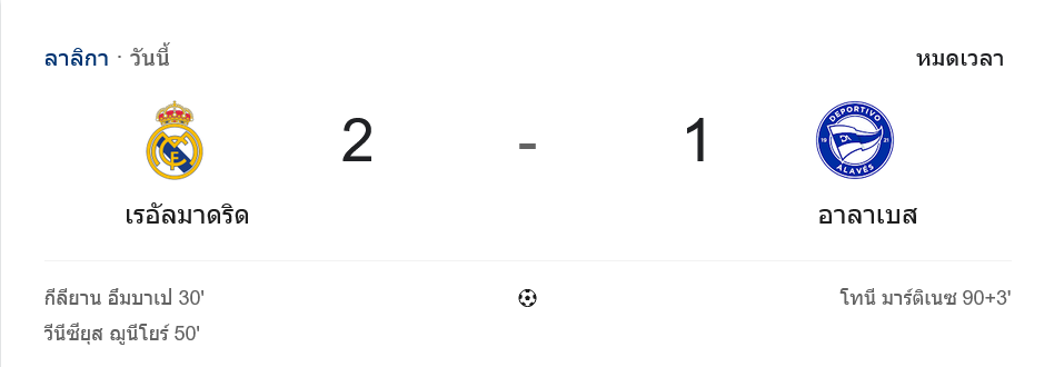 เรอัล มาดริดเก็บสามแต้มลาลีกาแบบมีเสียว หลังเปิดบ้านเฉือนอลาเบส 2-1 ในเกมที่พวกเขาเหนือกว่าชัดเจนเกือบตลอด 90 นาที สองประตูจาก คีลิยัน เอ็มบั๊ปเป้ และ วินิซิอุส จูเนียร์ พาราชันชุดขาวเดินหน้าล่าคะแนนต่อ ส่วนอลาเบสแม้แพ้ แต่ก็ยังฮึดไล่กดดันช่วงท้ายจนเจ้าถิ่นต้องลุ้นเหนื่อย
