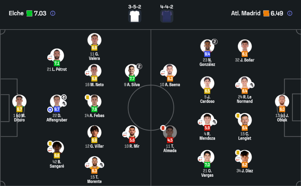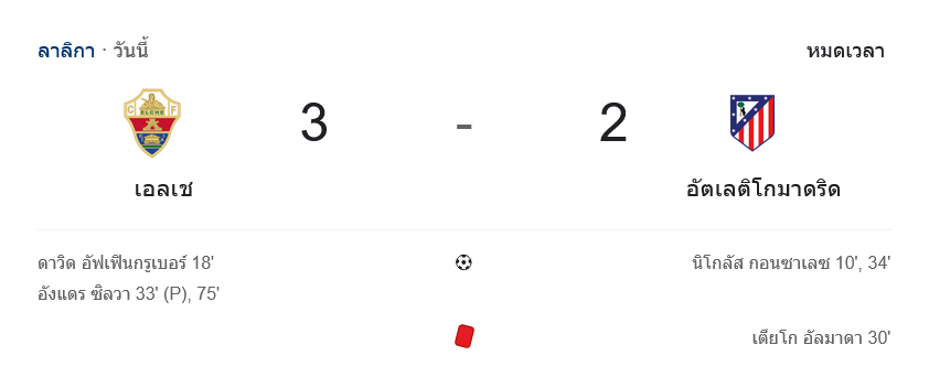 แม้แอตเลติโกจะเหลือผู้เล่น 10 คน แต่ยังพยายามประคองเกมและสวนกลับเป็นระยะ ทว่าเอลเช่เป็นฝ่ายคุมจังหวะได้ชัดกว่า บุกกดดันจากลูกนิ่งและริมเส้นต่อเนื่อง ก่อนมาได้ประตูชัย 3-2 ในนาที 75 จาก อังเดร ซิลวา ที่เข้าชาร์จเด็ดขาดจากจังหวะเตะมุม