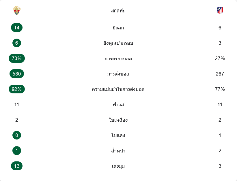 รูปเกมสะท้อนชัดว่าเอลเช่เหนือกว่าแทบทุกด้าน พวกเขาครองบอลถึง 73 เปอร์เซ็นต์ ยิงรวม 14 ครั้ง เข้ากรอบ 6 ครั้ง และผ่านบอลแม่นยำถึง 92 เปอร์เซ็นต์ ขณะที่แอตเลติโก มาดริดมีโอกาสยิง 6 ครั้ง เข้ากรอบ 3 หน และครองบอลเพียง 27 เปอร์เซ็นต์ จุดที่เห็นชัดที่สุดคือเอลเช่ได้เตะมุมมากถึง 13 ครั้ง ซึ่งกลายเป็นต้นทางของเกมรุกอันตรายตลอดทั้งนัด