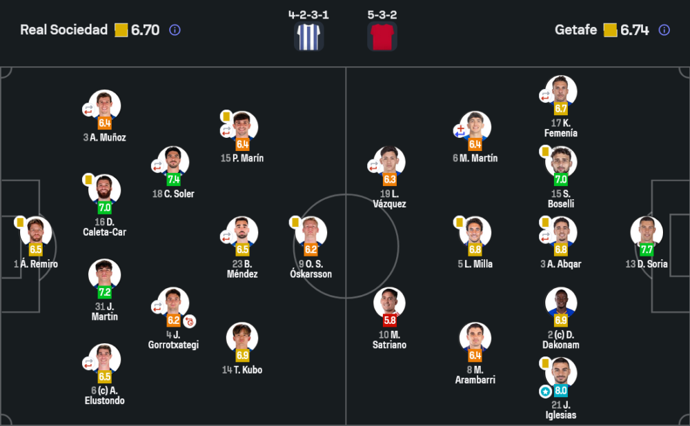 โซเซียดาดมาในระบบ 4-2-3-1 เน้นครองบอลและใช้เกมริมเส้นเป็นอาวุธหลัก พวกเขาครองจังหวะได้เหนือกว่าอย่างเห็นได้ชัด โดยมี คุโบะ, เมนเดซ และ โซเลร์ คอยปั้นเกมรุก แต่ปัญหาคือจังหวะจบไม่เฉียบพอ ทั้งการยิงชนเสาจากจุดโทษ การตัดสินใจในพื้นที่สุดท้าย และการเจอแนวรับเกตาเฟ่ที่ยืนกันแน่นมาก