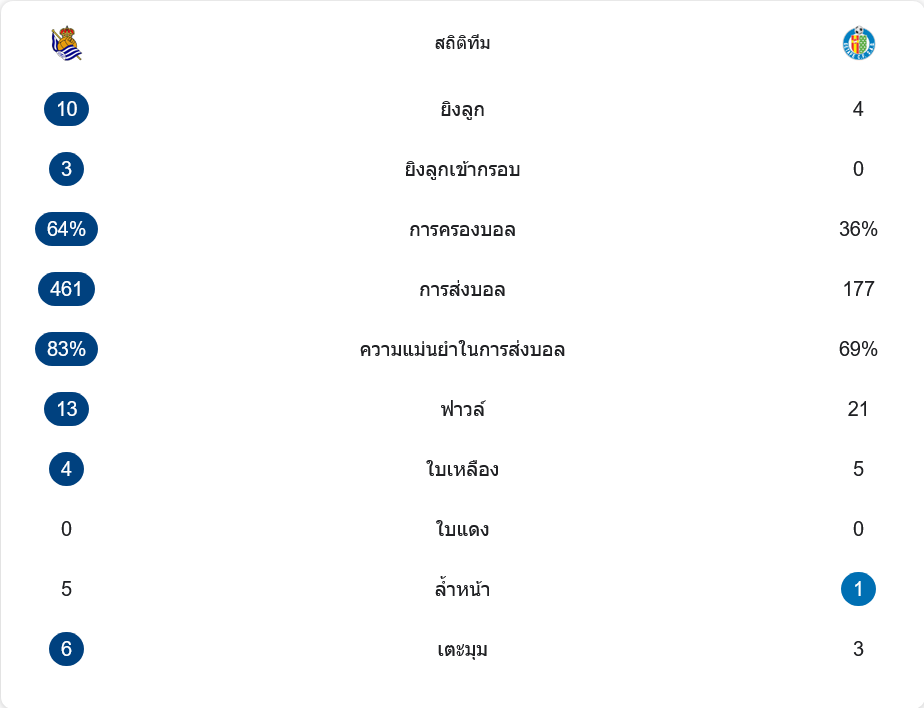 แต่เกตาเฟ่เด่นในเกมรับและเกมปะทะ พวกเขาทำฟาวล์ 21 ครั้ง รับไป 5 ใบเหลือง และยอมเล่นเกมอึดอัดเพื่อรักษาสกอร์ ส่วนโซเซียดาดได้เตะมุม 6 ครั้ง และโดนจับล้ำหน้าถึง 5 หน สะท้อนว่าพยายามเร่งเจาะแนวรับตลอด แต่จังหวะสุดท้ายยังไม่ดีพอ