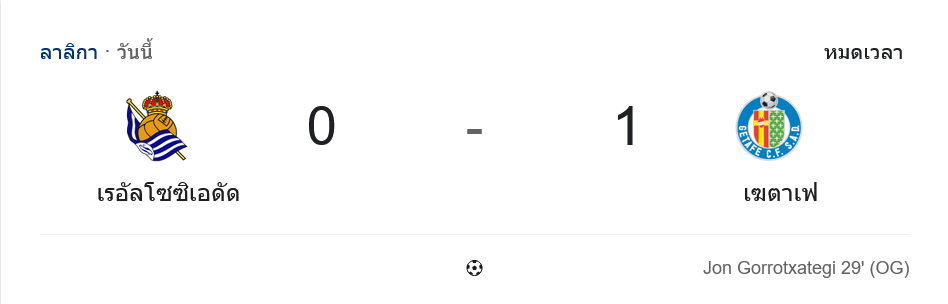 บ้านผลบอล เกมนี้เจ็บจริงสำหรับ เรอัล โซเซียดาด เพราะเป็นฝ่ายครองบอลมากกว่า บุกมากกว่า และมีจังหวะลุ้นหลายครั้ง แต่สุดท้ายกลับแพ้คาบ้านให้ เกตาเฟ่ 0-1 จากการทำเข้าประตูตัวเองของ จอน กอร์รอตชาเตกี นาที 29 ส่งให้ทีมเยือนโกยสามแต้มสำคัญในศึก ลาลีกา สเปน ได้แบบสุดเขี้ยว ขณะที่เจ้าถิ่นต้องผิดหวังกับ ผลบอลสด ที่สวนทางกับรูปเกมอย่างชัดเจน