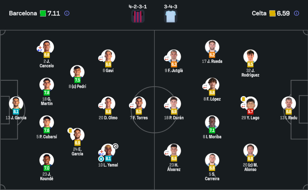 • นักเตะเด่น : ลามีน ยามาล 8.1, โจน การ์เซีย 8.1, เคราร์ด มาร์ติน 7.8