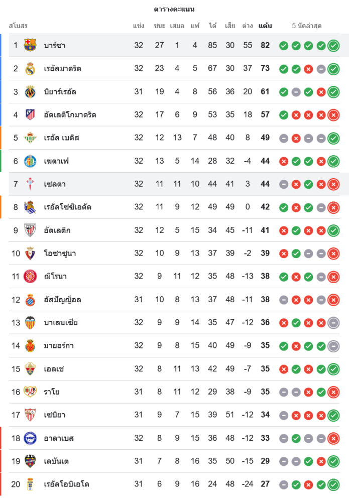สถานการณ์ในตารางคะแนนลาลีกา สเปน