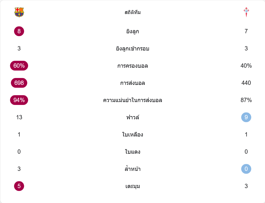 เกมนี้บาร์เซโลน่ายิง 8 ครั้ง เข้ากรอบ 3 ครั้ง ครองบอล 60 เปอร์เซ็นต์ และผ่านบอล 698 ครั้งด้วยความแม่นยำ 94 เปอร์เซ็นต์ ส่วนเซลต้ายิง 7 ครั้ง เข้ากรอบ 3 ครั้ง ครองบอล 40 เปอร์เซ็นต์ ผ่านบอล 440 ครั้ง ความแม่นยำ 87 เปอร์เซ็นต์ เจ้าบ้านได้เตะมุม 5 ครั้ง ส่วนทีมเยือนได้ 3 ครั้ง ทั้งสองทีมโดนใบเหลืองฝั่งละ 1 ใบ และไม่มีใบแดง ภาพรวมเป็นเกมที่บาร์ซ่าคุมเกมได้มากกว่า แต่เซลต้าก็สู้ด้วยวินัยและสร้างแรงกดดันได้ตลอดจนวินาทีสุดท้าย