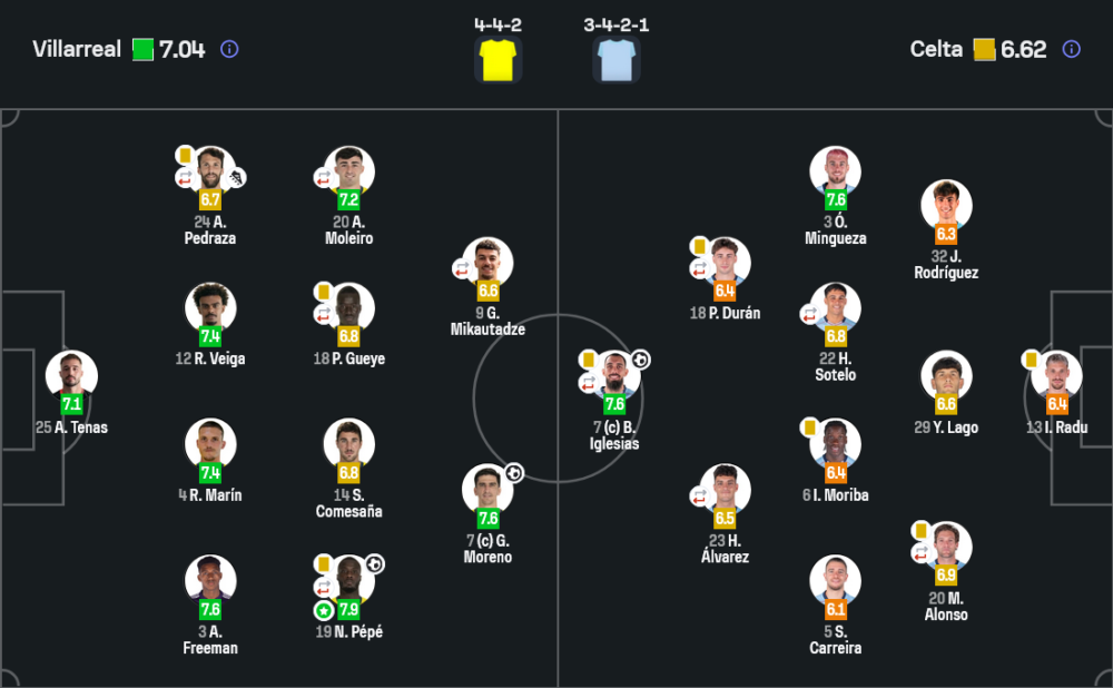 นิโกลาส เปเป้ คว้าตำแหน่ง Player of the Match ด้วยคะแนน 7.9 จากผลงานยิงประตูสำคัญและสร้างปัญหาให้เกมรับเซลต้าตลอดเวลา จังหวะยิงให้ทีมหนี 2-0 คือช็อตเปลี่ยนเกมที่ทำให้บียาร์เรอัลได้เปรียบชัดเจน แม้ถูกเปลี่ยนออกช่วงท้าย แต่ผลงานก่อนหน้านั้นคมและมีผลโดยตรงต่อชัยชนะ