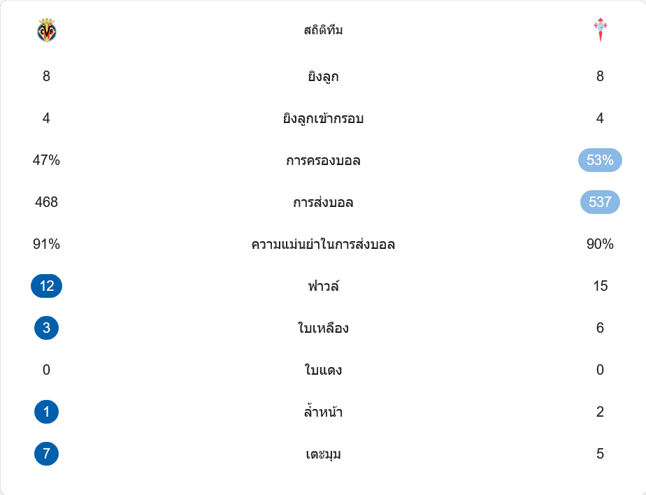 เกมนี้ทั้งสองทีมยิงเท่ากัน 8 ครั้ง และยิงเข้ากรอบเท่ากัน 4 ครั้ง แต่เซลต้าครองบอลมากกว่า 53 เปอร์เซ็นต์ พร้อมผ่านบอล 537 ครั้ง เหนือกว่าบียาร์เรอัลที่ผ่านบอล 468 ครั้ง อย่างไรก็ตาม ความแม่นยำแทบไม่ต่างกัน เจ้าถิ่นอยู่ที่ 91 เปอร์เซ็นต์ ส่วนทีมเยือน 90 เปอร์เซ็นต์ จุดตัดสินคือความเฉียบขาด บียาร์เรอัลใช้โอกาสสำคัญได้ดีกว่า ขณะที่เซลต้าฟาวล์มากกว่า 15 ครั้ง และโดนใบเหลืองถึง 6 ใบ