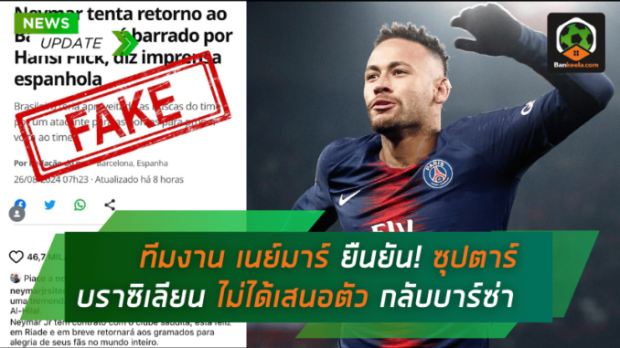 ทีมงานของ เนย์มาร์ กองหน้าซุปตาร์จากทีม อัล-ฮิลาล ออกมาปฏิเสธข่าวลือที่ระบุว่า ดาวเตะชาวบราซิเลียนรายนี้มีความประสงค์ที่จะกลับไปค้าแข้งกับ บาร์เซโลน่า สโมสรยักษ์ใหญ่ในศึกลา ลีกา สเปน โดยยืนยันว่า เนย์มาร์ยังคงมีความสุขกับชีวิตใหม่ในประเทศซาอุดีอาระเบียและไม่มีแผนที่จะย้ายกลับไปเล่นในยุโรป