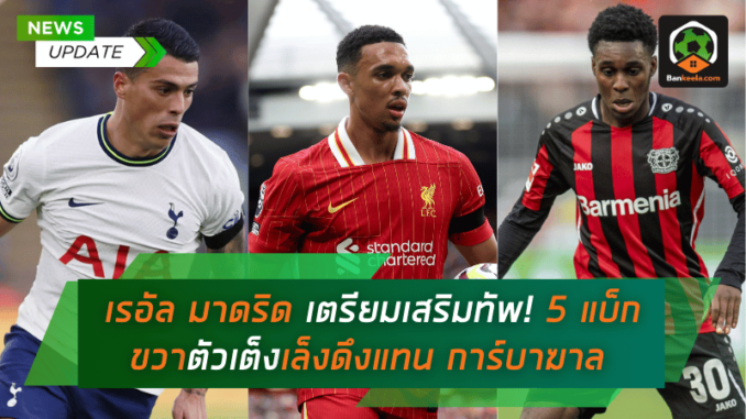 ด้วยสถานการณ์ที่ไม่คาดฝันเกิดขึ้น เมื่อ ดานี่ การ์บาฆาล แบ็กขวาคนสำคัญของ เรอัล มาดริด ได้รับบาดเจ็บหนักถึงขั้นเอ็นหัวเข่าฉีก ทำให้ต้องพักรักษาตัวอย่างน้อย 8 เดือน ทำให้สโมสรยักษ์ใหญ่แห่งสเปนจำเป็นต้องเร่งหาตัวแทนอย่างเร่งด่วน และมีความเป็นไปได้สูงที่พวกเขาจะต้องเสริมทัพในตำแหน่งแบ็กขวาก่อนเวลาที่วางแผนไว้เดิม โดยในขณะนี้ทีมแชมป์ยุโรป 15 สมัยได้จับตามอง 5 แบ็กขวาฝีเท้าเยี่ยมที่อาจเข้ามาเติมเต็มตำแหน่งนี้ มาดูกันว่ามีใครบ้าง