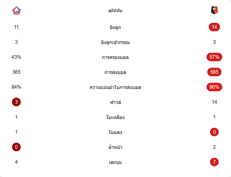ฝั่งแรนส์ครองบอลถึง 57% จ่ายบอล 565 ครั้ง ความแม่นยำสูงถึง 90% แสดงให้เห็นว่าคุมจังหวะและเซ็ตเกมบุกได้ดีกว่าอย่างชัดเจน แม้จะยิงเข้ากรอบเท่ากันที่ 3 ครั้ง แต่คุณภาพโอกาสชัดเจนกว่ามาก และสามารถเปลี่ยนเป็นสองประตูสำคัญ ขณะที่จำนวนฟาวล์แรนส์มากถึง 14 ครั้ง เทียบกับลีลล์แค่ 3 ครั้ง บอกได้ว่า ทีมเยือนพร้อมเล่นหนักเพื่อหยุดเกมสวนกลับทุกจังหวะ และไม่ปล่อยให้เจ้าบ้านได้เล่นง่ายเลย