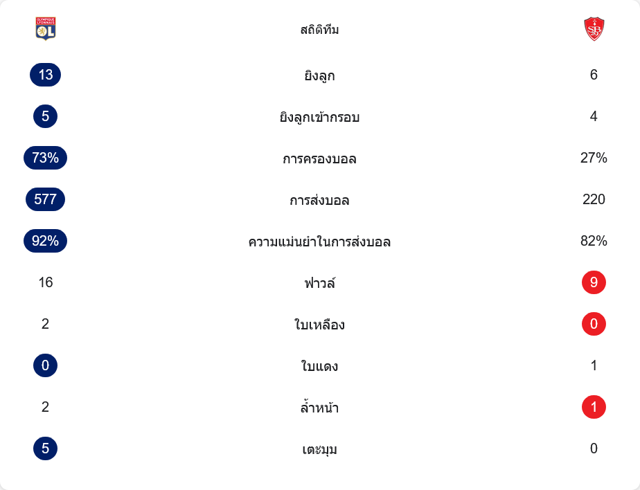 ตัวเลขหลังเกมยืนยันทุกอย่าง ลียงยิงรวม 13 ครั้ง เข้ากรอบ 5 ครั้ง ส่วนแบรสต์มีโอกาสเพียง 6 ครั้ง เข้ากรอบ 4 ครั้ง แต่ที่โหดคือการครองบอล เจ้าถิ่นถือบอลมากถึง 73 เปอร์เซ็นต์ ส่งบอลสำเร็จ 577 ครั้ง ด้วยความแม่นยำ 92 เปอร์เซ็นต์ ขณะที่ทีมเยือนส่งแค่ 220 ครั้ง ความแม่นยำ 82 เปอร์เซ็นต์