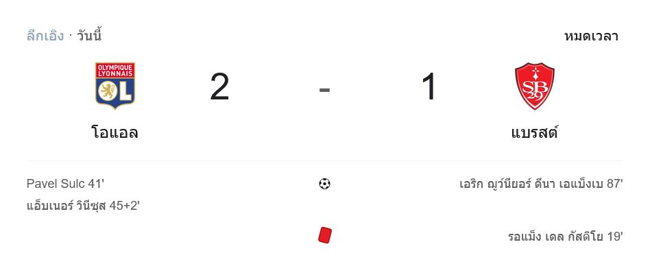 ศึกลีกเอิง ฝรั่งเศส ที่กรูปาม่า สเตเดียม เกมนี้กลายเป็นค่ำคืนของคนรักบอลและสายเช็กผลแบบเรียลไทม์ เพราะรูปเกมโคตรเข้มข้นตั้งแต่นาทีแรกจนสิ้นเสียงนกหวีดสุดท้าย ใครเปิดดูเช็ก ผลบอลสด พร้อมกันต้องรู้สึกเหมือนได้ดูหนังดราม่าฟุตบอลเต็มเรื่อง ลียงอาศัยตัวผู้เล่นมากกว่า หลังแบรสต์เหลือสิบคนตั้งแต่ต้นครึ่งแรก เปิดบ้านบดเอาชนะ 2-1 จากประตูของ พาเวล ชูลช์ และ แอบเนอร์ วีนีซิอุส แม้ช่วงท้ายจะโดน จูเนียร์ ดีนา เอบิมเบ้ ยิงตีตื้นจนแฟนเจ้าถิ่นต้องลุ้นเหนื่อยก็ตาม