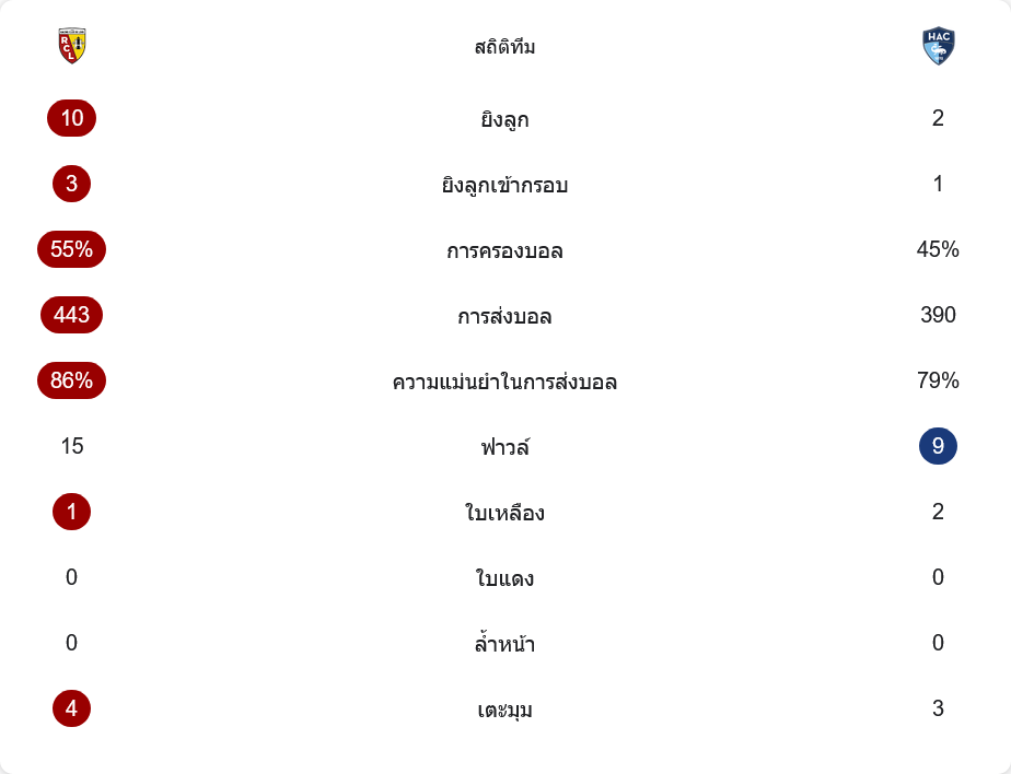ตัวเลขบอกเรื่องราวได้ชัดเจน ล็องส์ครองบอลมากกว่า 55% ต่อ 45% ของเลอ อาฟร์ จ่ายบอลทั้งเกม 443 ครั้ง ขณะที่ทีมเยือนทำได้ 390 ครั้ง แต่เปอร์เซ็นต์จ่ายบอลสำเร็จใกล้เคียงกันที่ 86% ต่อ 79% เจ้าบ้านยิงรวม 10 ครั้ง เข้ากรอบ 3 ส่วนเลอ อาฟร์มีโอกาสเพียง 2 ครั้ง เข้ากรอบแค่ลูกเดียว แสดงให้เห็นว่าเกมรุกทีมเยือนแทบไม่สามารถทะลุแนวรับคู่แข่งได้เลย