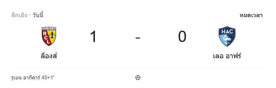 - ⚽ 45+1′ – ประตูขึ้นนำ 1-0 ของล็องส์ รูเบน อากีลาร์ เติมขึ้นมายิงในกรอบ หลังได้บอลต่อเนื่องจากฝั่งซ้ายของอูดอล