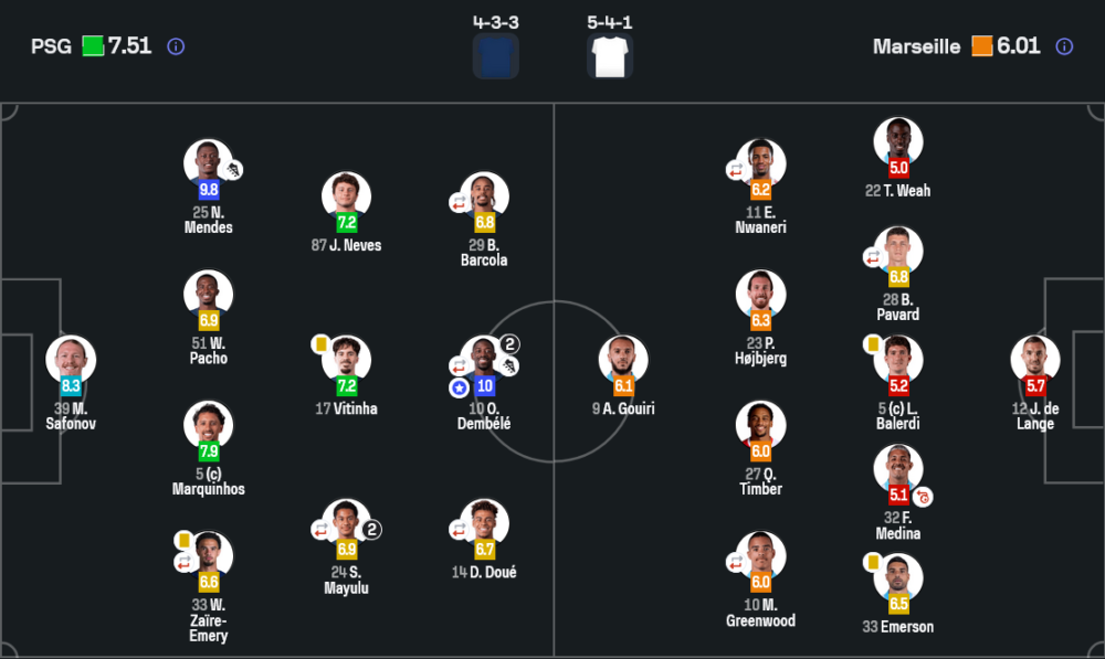 สองประตูในครึ่งแรกของเขาเปลี่ยนเกมทันที ลูกแรกคือการหาพื้นที่ระหว่างเซ็นเตอร์กับฟูลแบ็กแล้วจบสกอร์นิ่ง ๆ ส่วนลูกที่สองโชว์ความเฉียบขาดระดับท็อป ยิงมุมแคบเข้าสามเหลี่ยมแบบที่ผู้รักษาประตูได้แต่มอง นอกจากนั้น เดมเบเล่ยังเป็นตัวดึงแนวรับมาร์กเซยให้ไหลตาม จนเพื่อนร่วมทีมอย่าง เมนเดส มายูลู และควารัตสเคเลีย มีช่องเล่นตลอดเวลา ฟอร์มแบบนี้แฟนบอลเปแอสเชคงหวังให้รักษามาตรฐานไว้ยาว ๆ ในเส้นทางลุ้นแชมป์และบอลถ้วยยุโรป