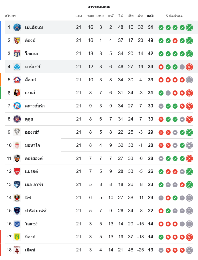 ฝั่งโอลิมปิก มาร์กเซยที่ก่อนแข่งยืนอันดับ 4 มี 39 คะแนน จากผลงานชนะ 12 เสมอ 3 แพ้ 6 ความพ่ายแพ้แบบเละเทะในเกมนี้อาจไม่ทำให้หลุดท็อปโฟร์ทันที แต่ทำให้ช่องว่างกับทีมตามหลังอย่างลีลล์และแรนส์หายใจรดต้นคอ ถ้าไม่รีบเรียกฟอร์มกลับมา มีโอกาสโดนเบียดแย่งพื้นที่ยุโรปแน่นอน