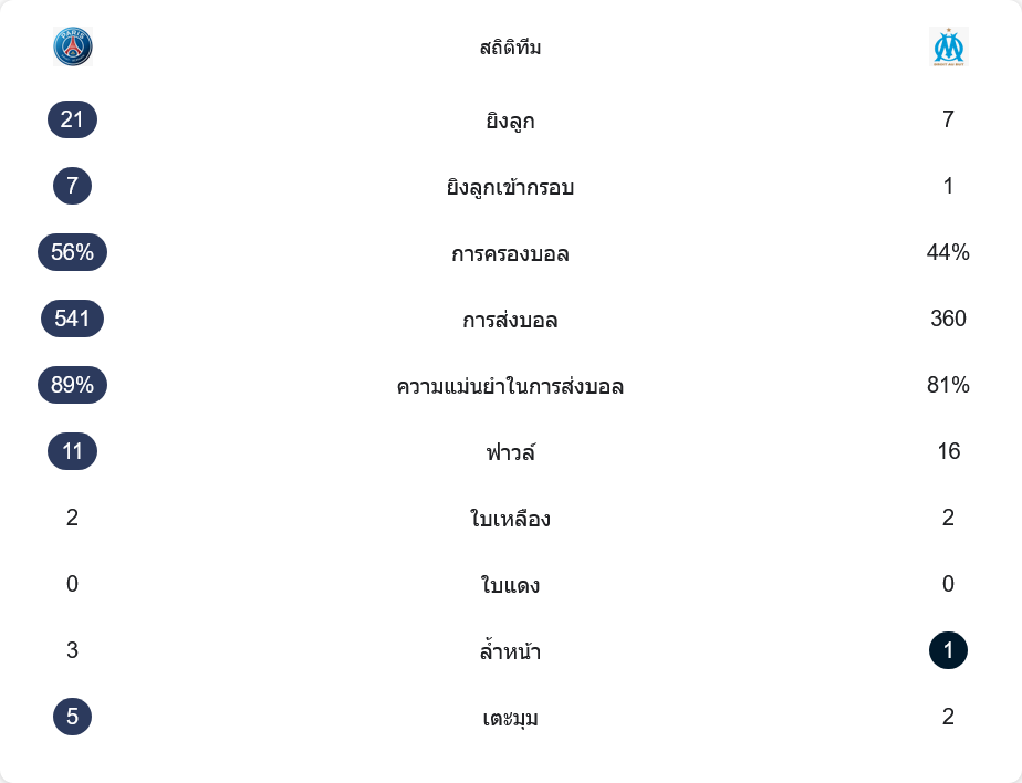 การครองบอลเปแอสเชเหนือกว่าเล็กน้อยที่ 56% ต่อ 44% แต่ที่สำคัญคือคุณภาพการต่อเกม พวกเขาจ่ายบอลสำเร็จถึง 89% จาก 541 ครั้ง แสดงให้เห็นถึงความมั่นใจและจังหวะเข้าทำที่ลื่นไหล ส่วนมาร์กเซยจ่าย 360 ครั้ง ความแม่นยำ 81% แต่ส่วนใหญ่เป็นบอลแก้ไขสถานการณ์มากกว่าจะสร้างโอกาสชัดเจน