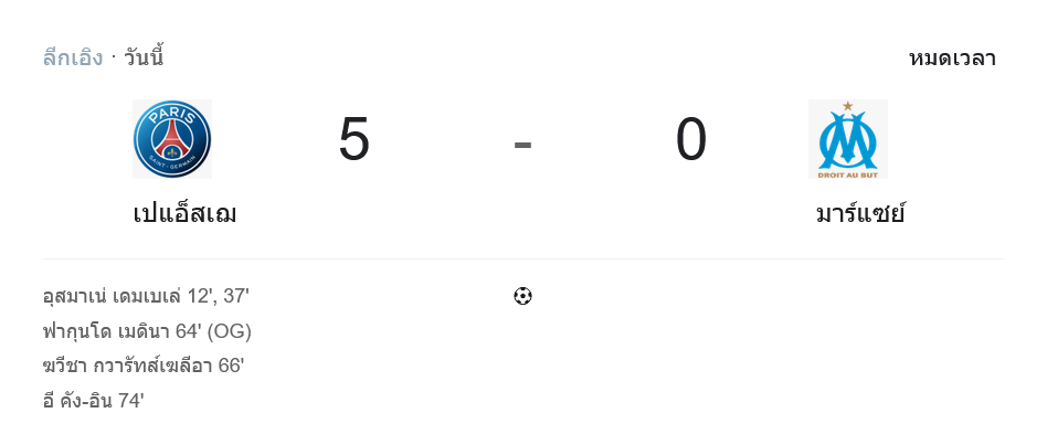 อุสมาน เดมเบเล่ ระเบิดฟอร์มระดับโลกซัดสองประตู ตั้งแต่ครึ่งแรกก่อนที่ครึ่งหลัง เปแอสเชจะรัวเพิ่มจากการทำเข้าประตูตัวเองของฟาคุนโด เมดินา บวกกับเม็ดสุดคมของสองตัวสำรองอย่างควิชา ควารัตสเคเลีย และ อี คัง-อิน ส่งผลให้ปารีสเก็บสามแต้มแบบสบายเท้า พร้อมยึดตำแหน่งจ่าฝูงลีกเอิงเหนียวแน่น ขณะที่มาร์กเซยพังไม่เป็นท่า แพ้แบบแทบไม่มีทรงเกมรุก