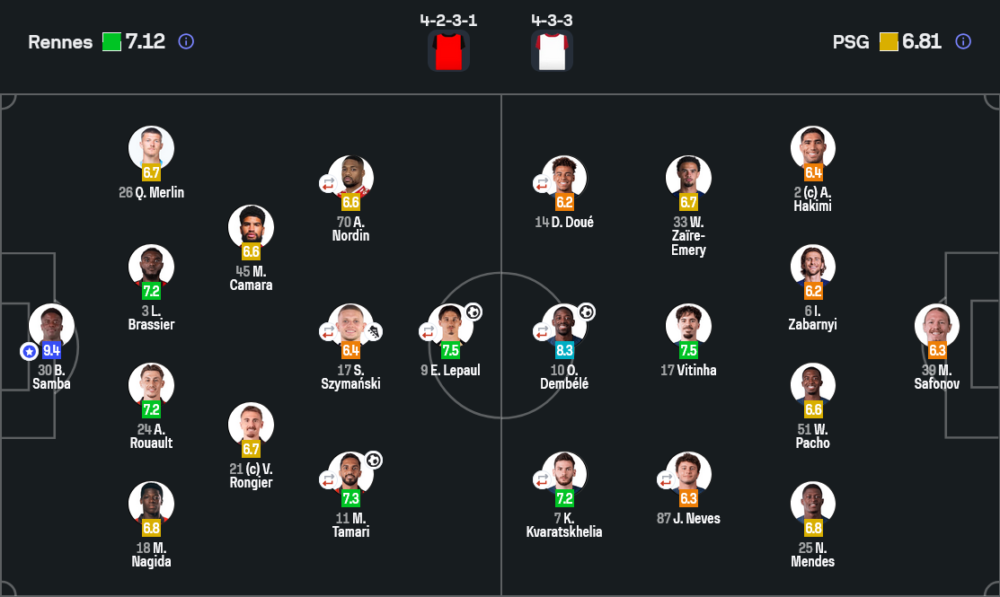 ตำแหน่ง Man of the Match ต้องยกให้ บรีส ซอมบา แบบไม่มีข้อโต้แย้ง เรตติ้งระดับ 9.4 สะท้อนทุกอย่าง นายด่านแรนส์โชว์ฟอร์มหนึบตลอด 90 นาที เซฟลูกยิงทั้งใกล้และไกลของ เดมเบเล่, วิตินญ่า, รามอส และ อี คังอิน ได้หลายครั้ง ที่สำคัญคือเซฟช่วงที่สกอร์ยังสูสี 1-0 และ 2-1 ทำให้เพื่อนร่วมทีมมีเวลาและความมั่นใจพอจะสวนกลับปิดเกม