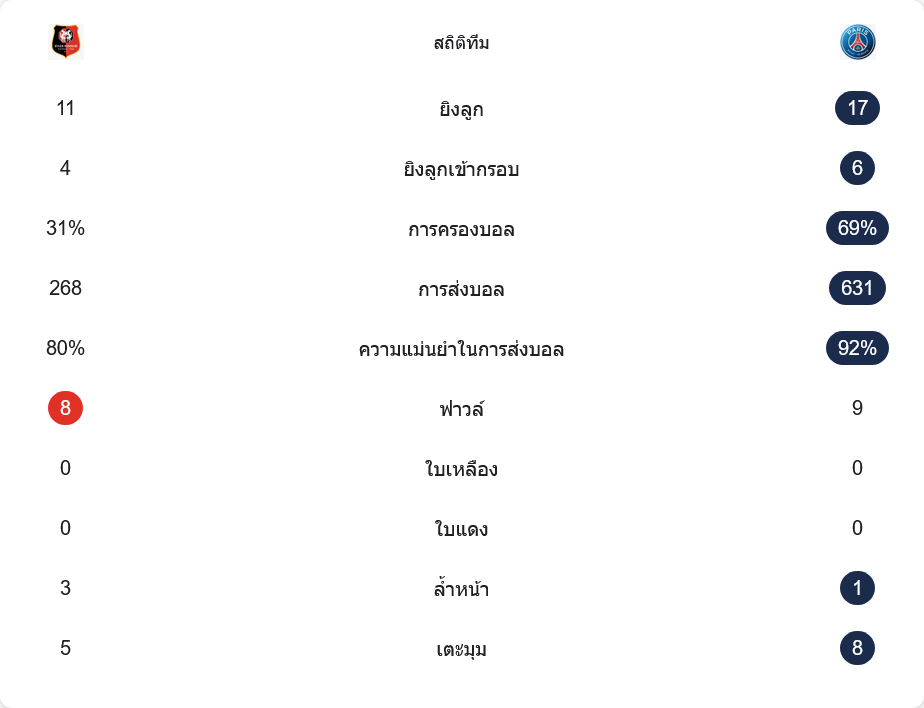 การครองบอลยิ่งชัดเจน แรนส์มีเพียง 31% เท่านั้น ปล่อยให้ปารีสครองบอลถึง 69% ส่งบอลสำเร็จ 631 ครั้ง ด้วยความแม่นยำถึง 92% เทียบกับเจ้าถิ่นที่ส่งบอลแค่ 268 ครั้ง ความแม่นยำ 80% แต่แทนที่จะสะท้อนถึงความเหนือกว่า กลับกลายเป็นสถิติ “ครองบอลแพ้” แบบเต็มปาก