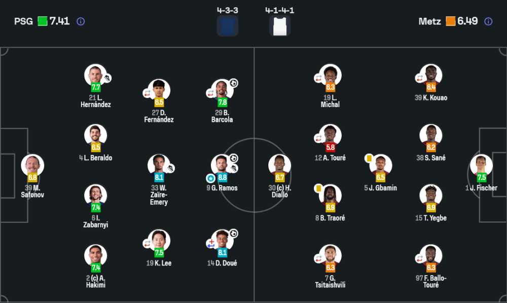 - Ibrahim Mbaye 6.5 ลงนาที 46 แทน Désiré Doué